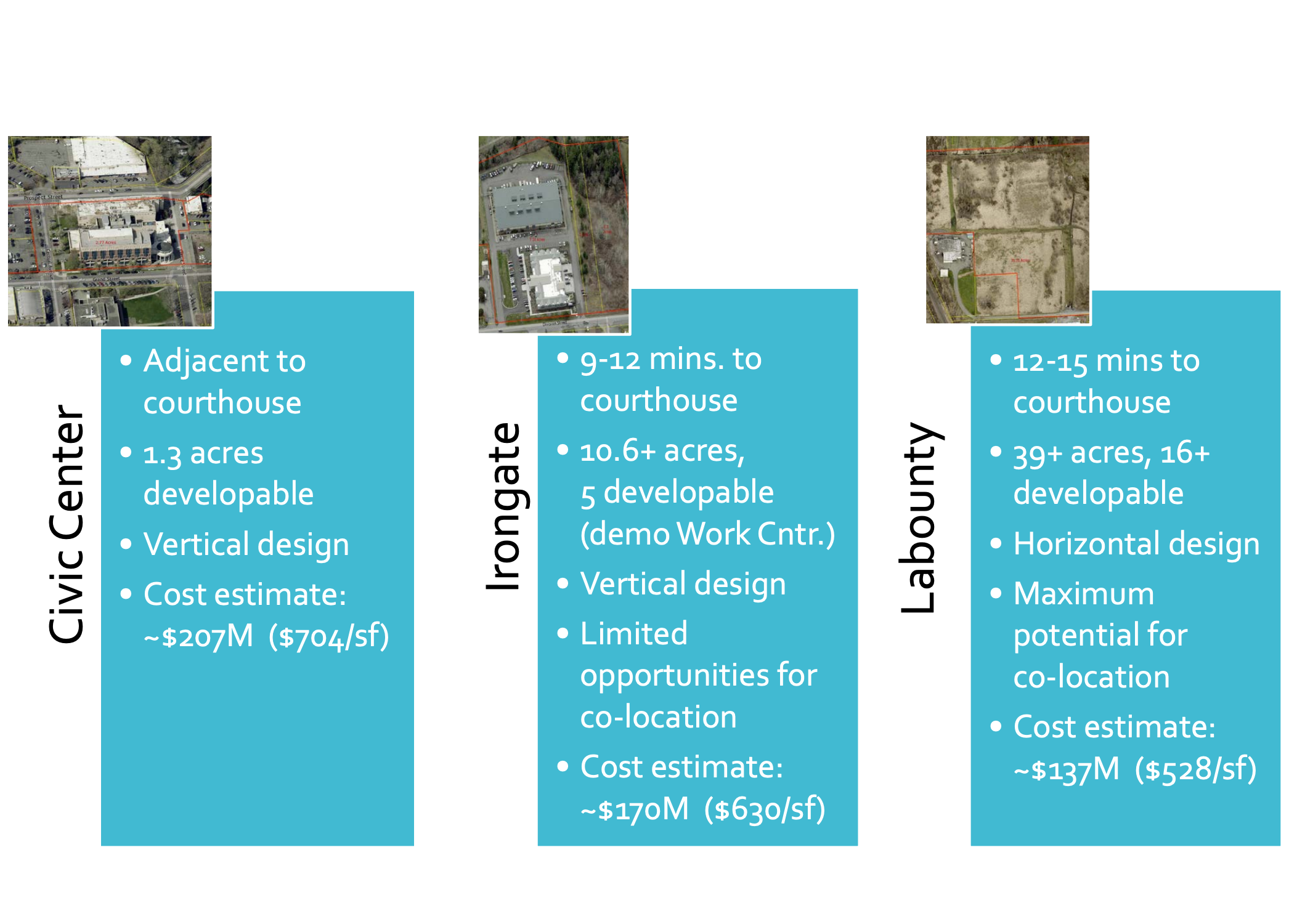 Two other county-owned sites were considered: 1) A vertical facility at Irongate with an estimated cost of $170 million, and 2) a vertical facility in downtown Bellingham with an estimated cost of $207 million.